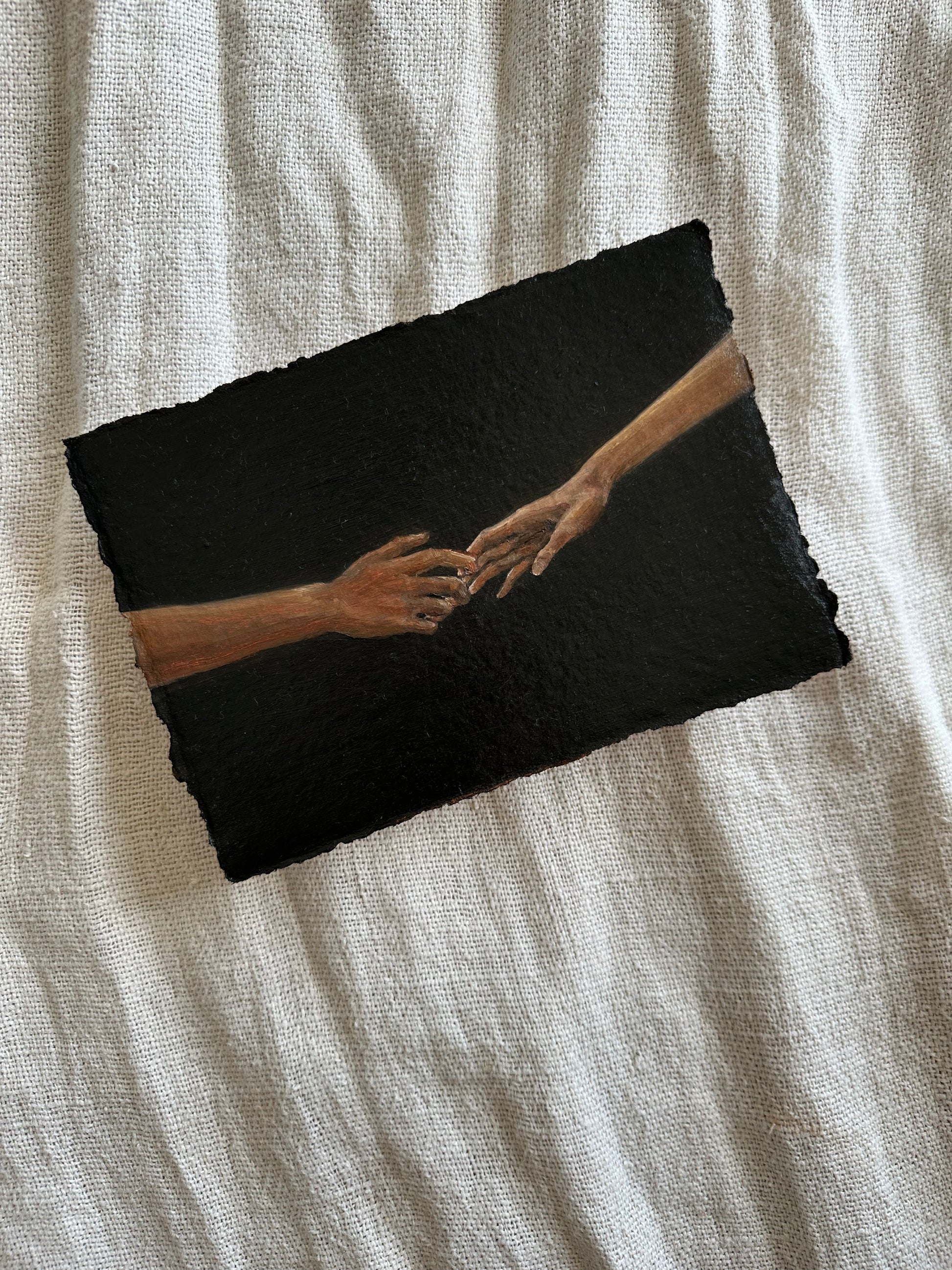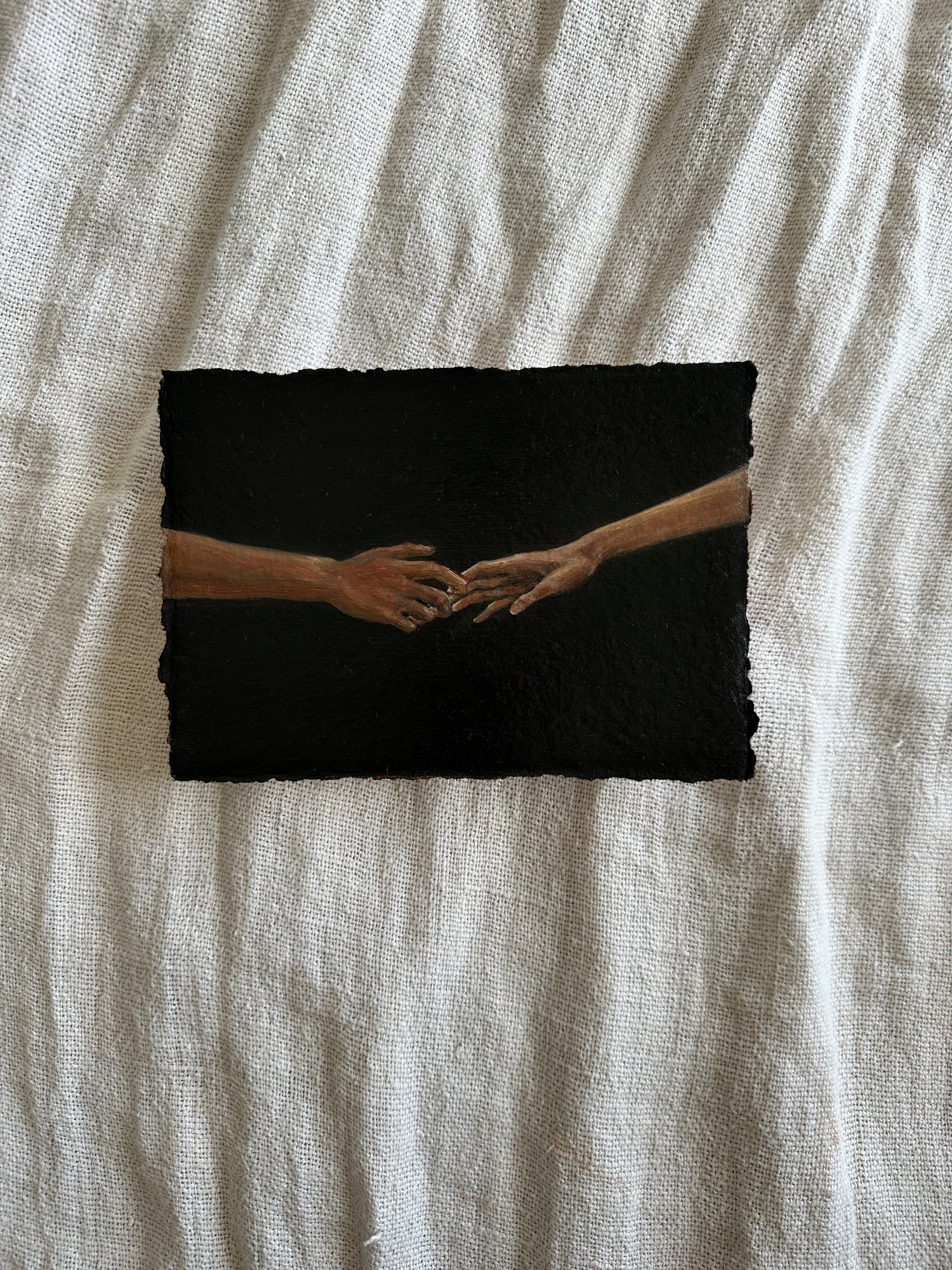 “A Quiet Connection” Original oil painting on handmade paper with deckled edging will be varnished and signed on the back once dry. Roughly A5 measurements due to the handmade nature of the paper (5.8” x 8.2”)