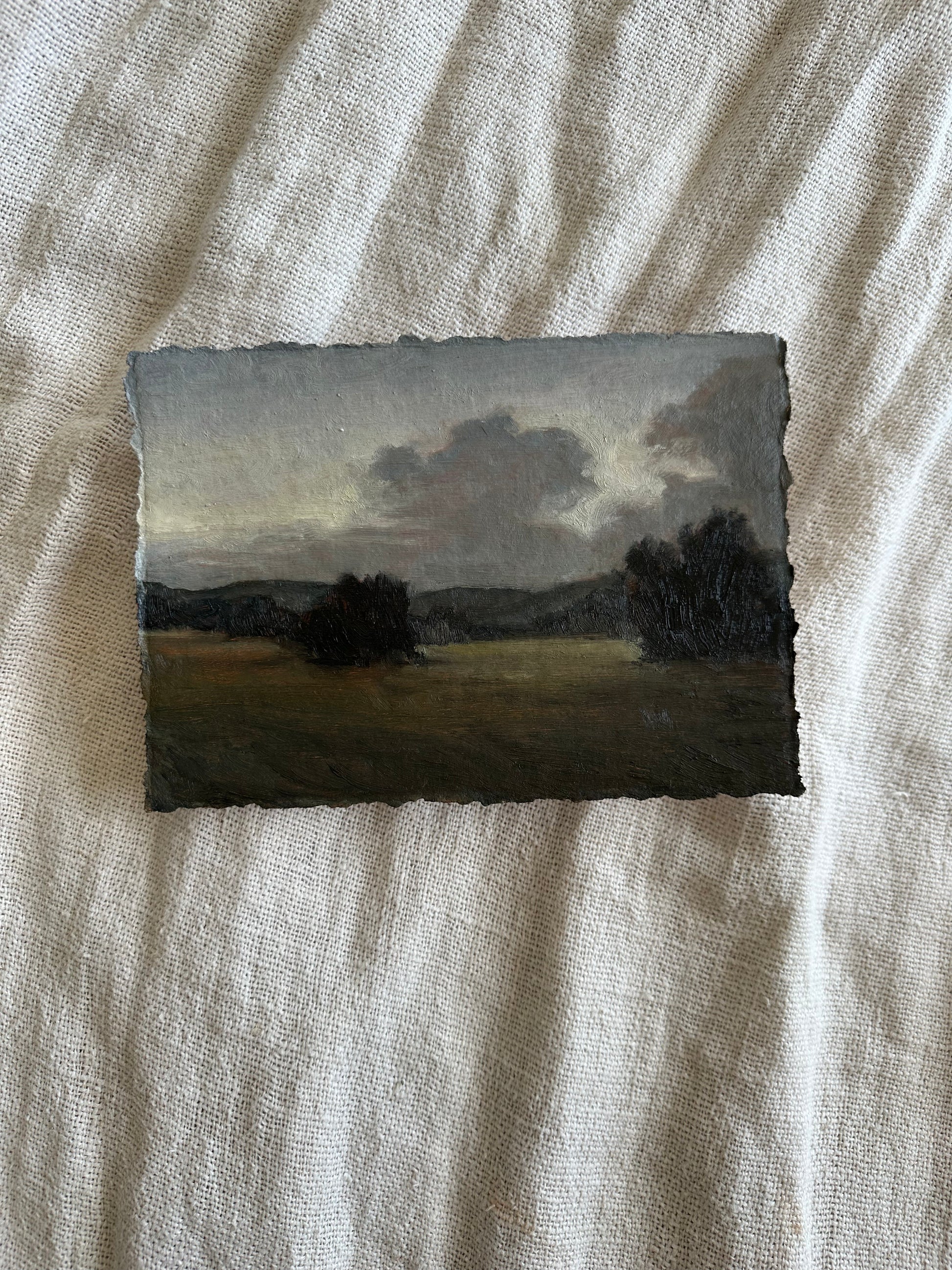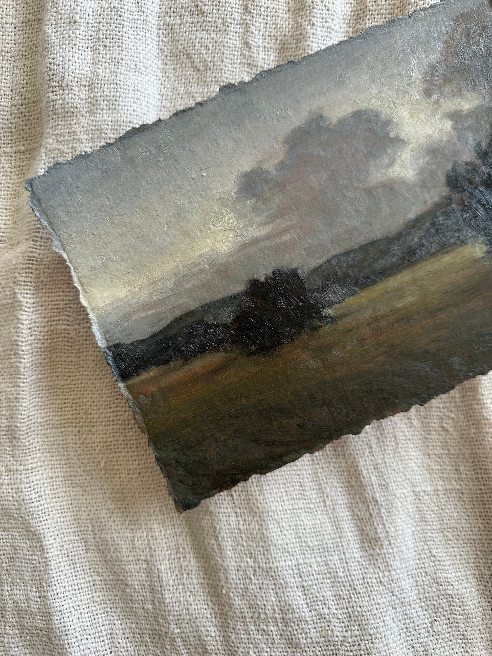 “As The Clouds Gathered Above” Original oil painting on handmade paper with deckled edging will be varnished and signed on the back once dry. Roughly A5 measurements due to the handmade nature of the paper (5.8” x 8.2”)