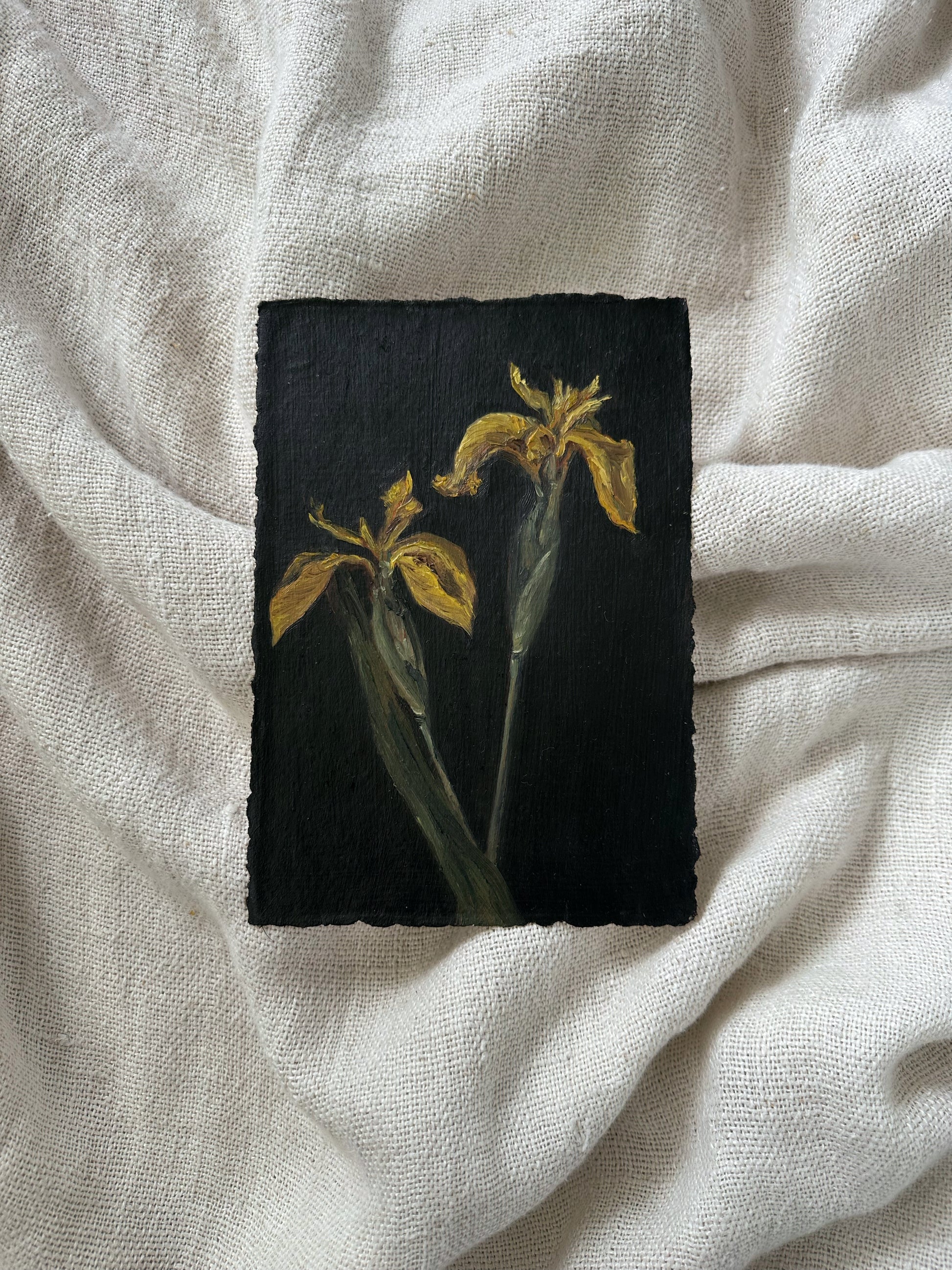 “Danse Silencieuse” Original oil painting on handmade paper with deckled edging will be varnished and signed on the back once dry. Roughly A5 measurements due to the handmade nature of the paper (5.8” x 8.2”)