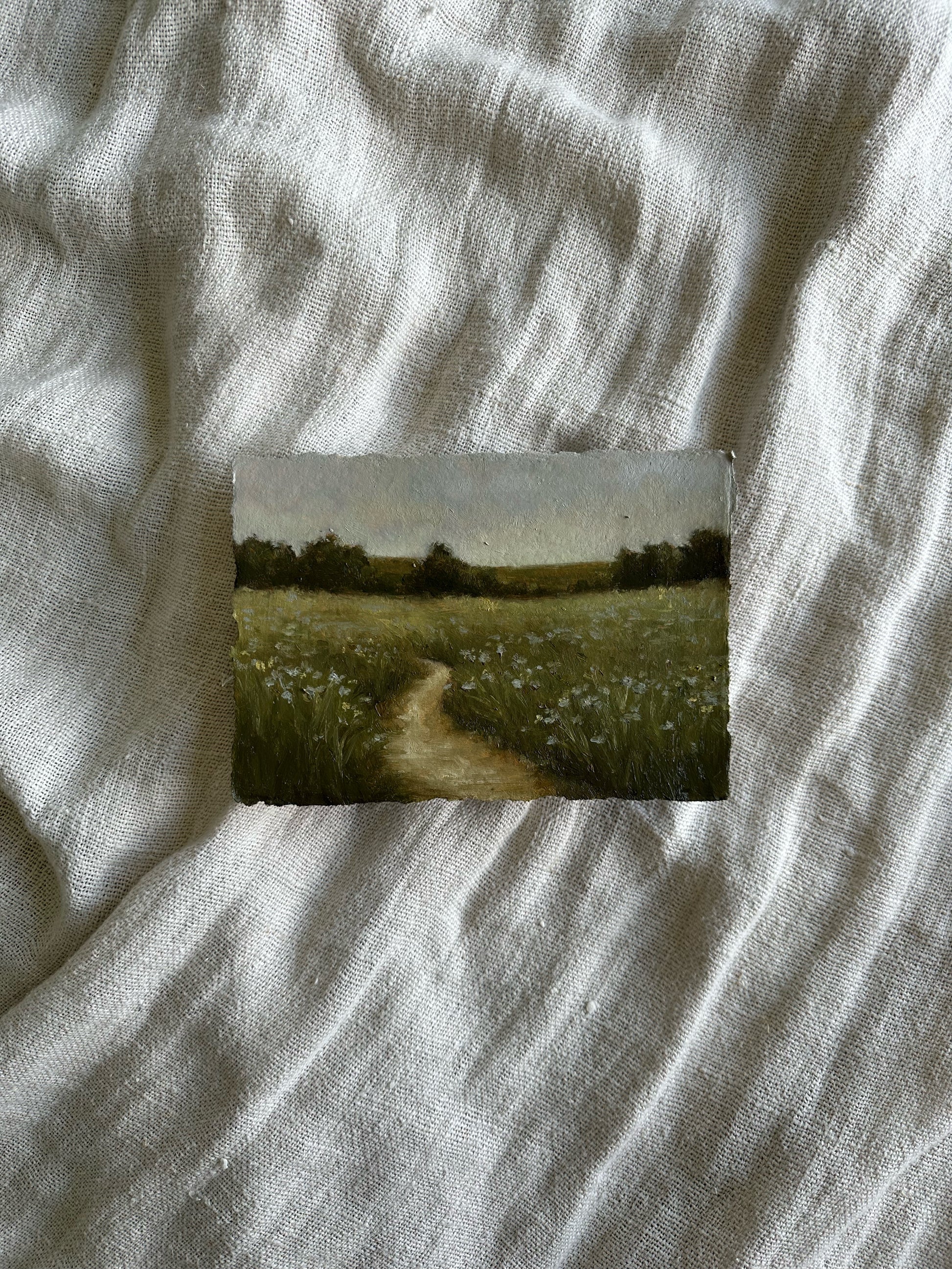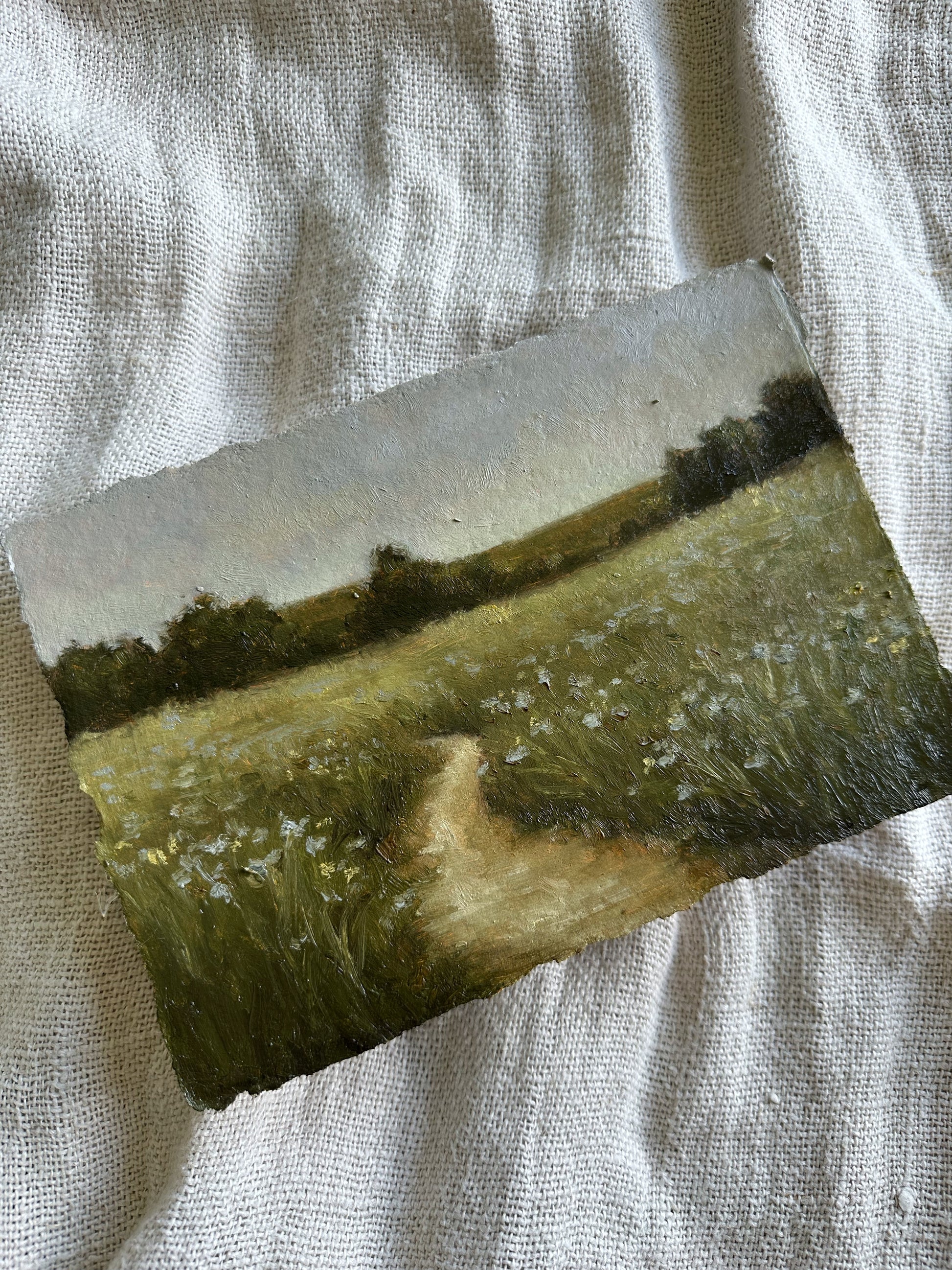 This Original oil painting on handmade paper with deckled edging will be varnished and signed on the back once dry. Roughly A5 measurements due to the handmade nature of the paper.