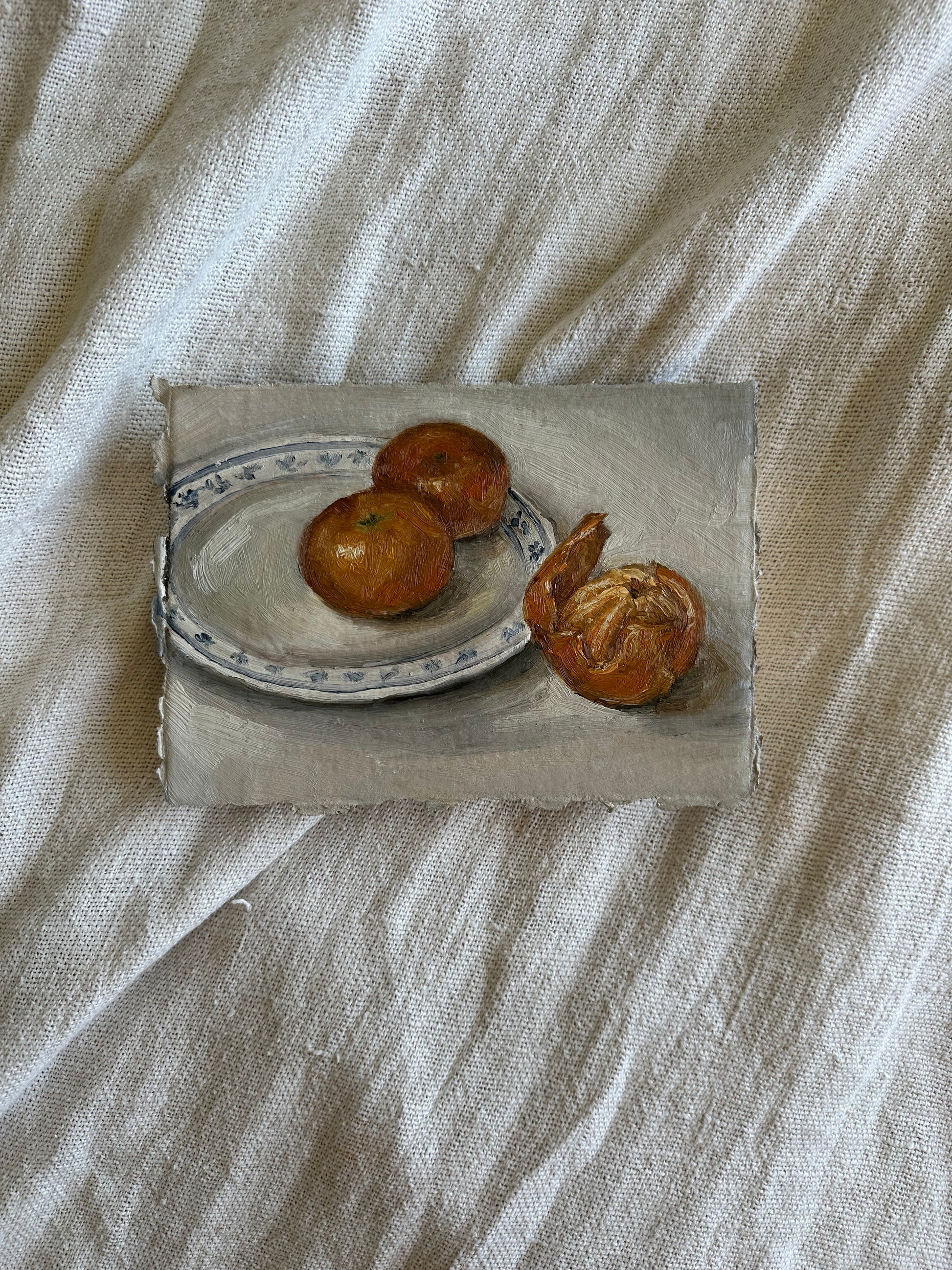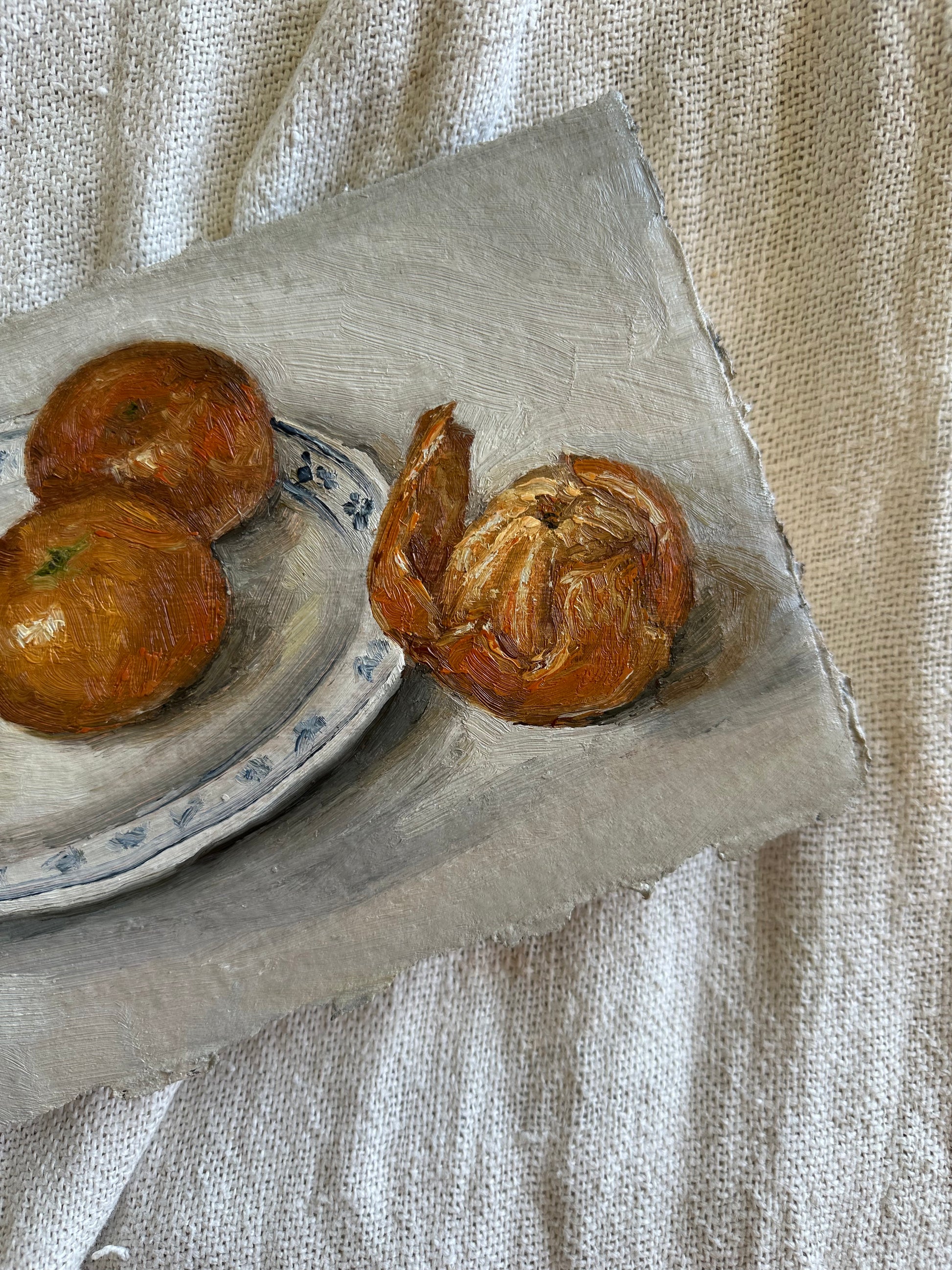 “Les Mandarines” Original oil painting on handmade paper with deckled edging will be varnished and signed on the back once dry. Roughly A5 measurements due to the handmade nature of the paper (5.8” x 8.2”)