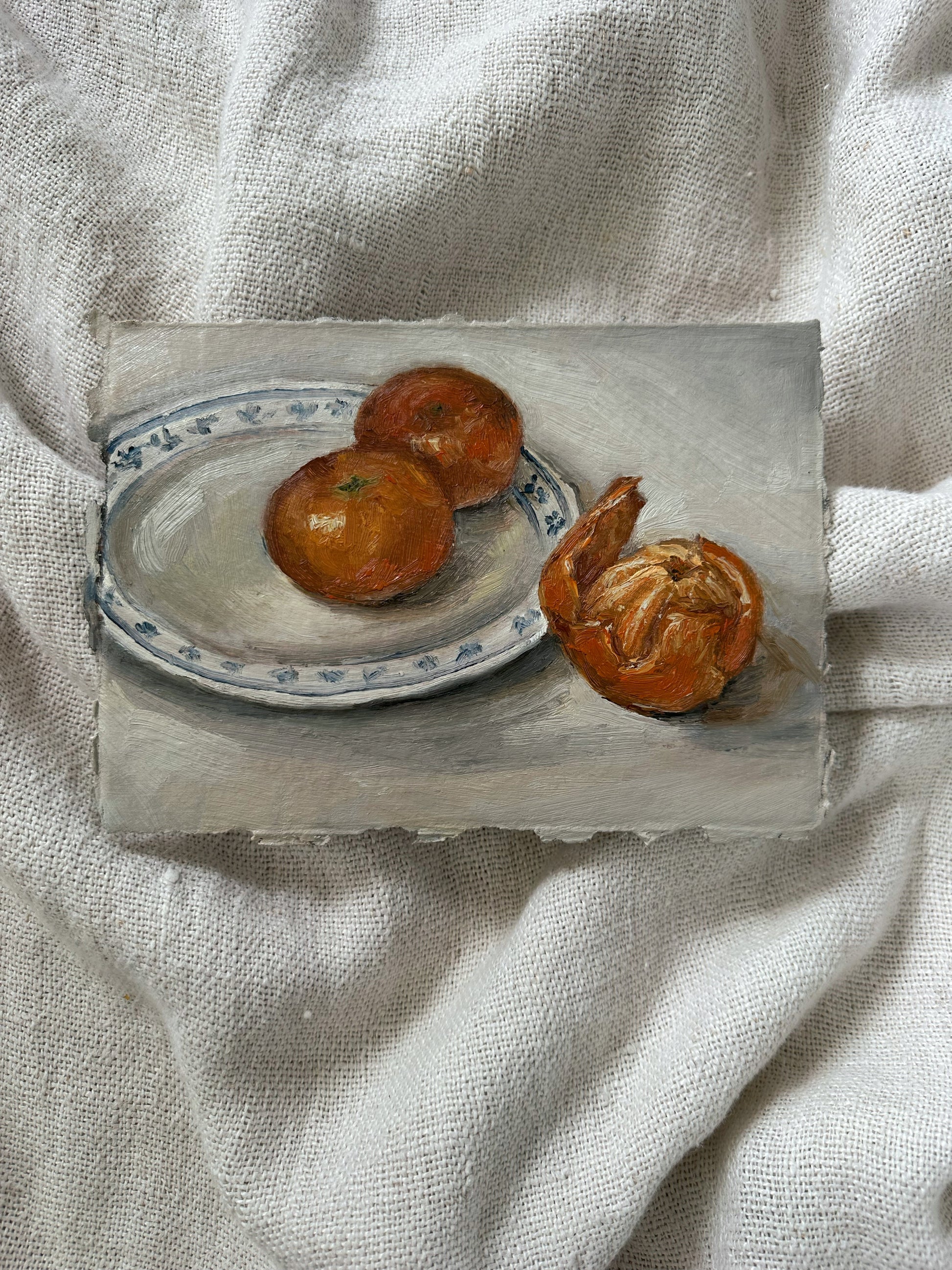 “Mandarins” Original oil painting on handmade paper with deckled edging will be varnished and signed on the back. Roughly A5 measurements due to the handmade nature of the paper (5.8” x 8.2”)
