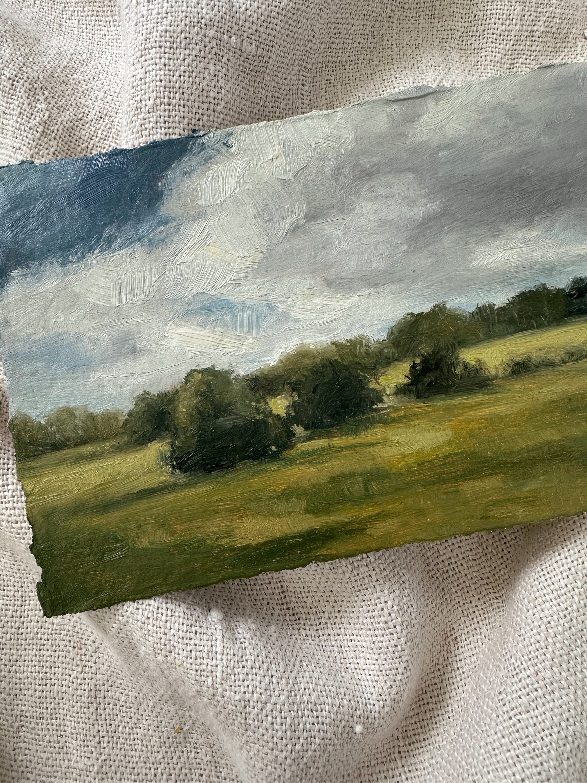 “Summer Sky” Original oil painting on handmade paper with deckled edging will be varnished and signed on the back once dry. Roughly A5 measurements due to the handmade nature of the paper (5.8” x 8.2”)