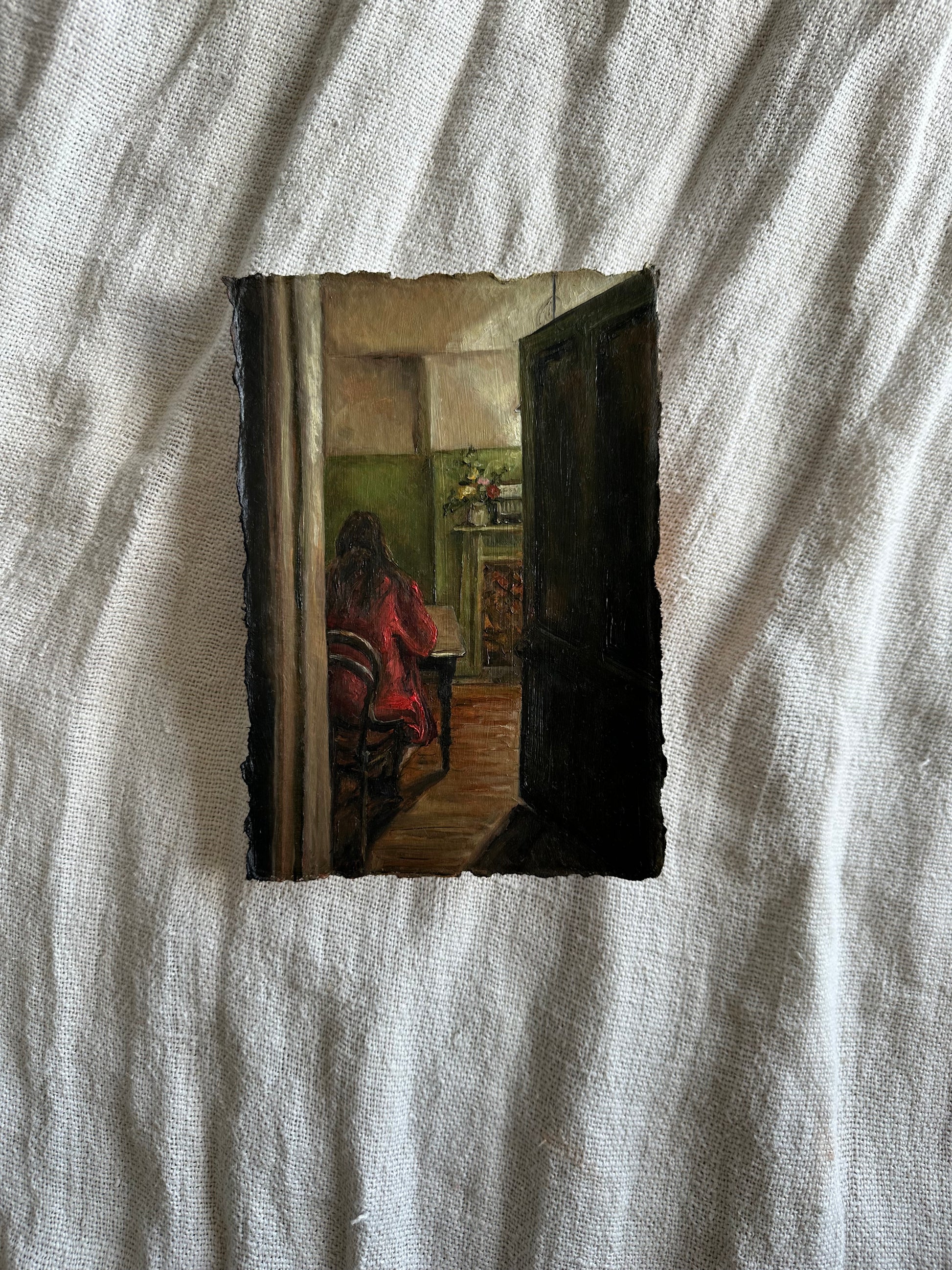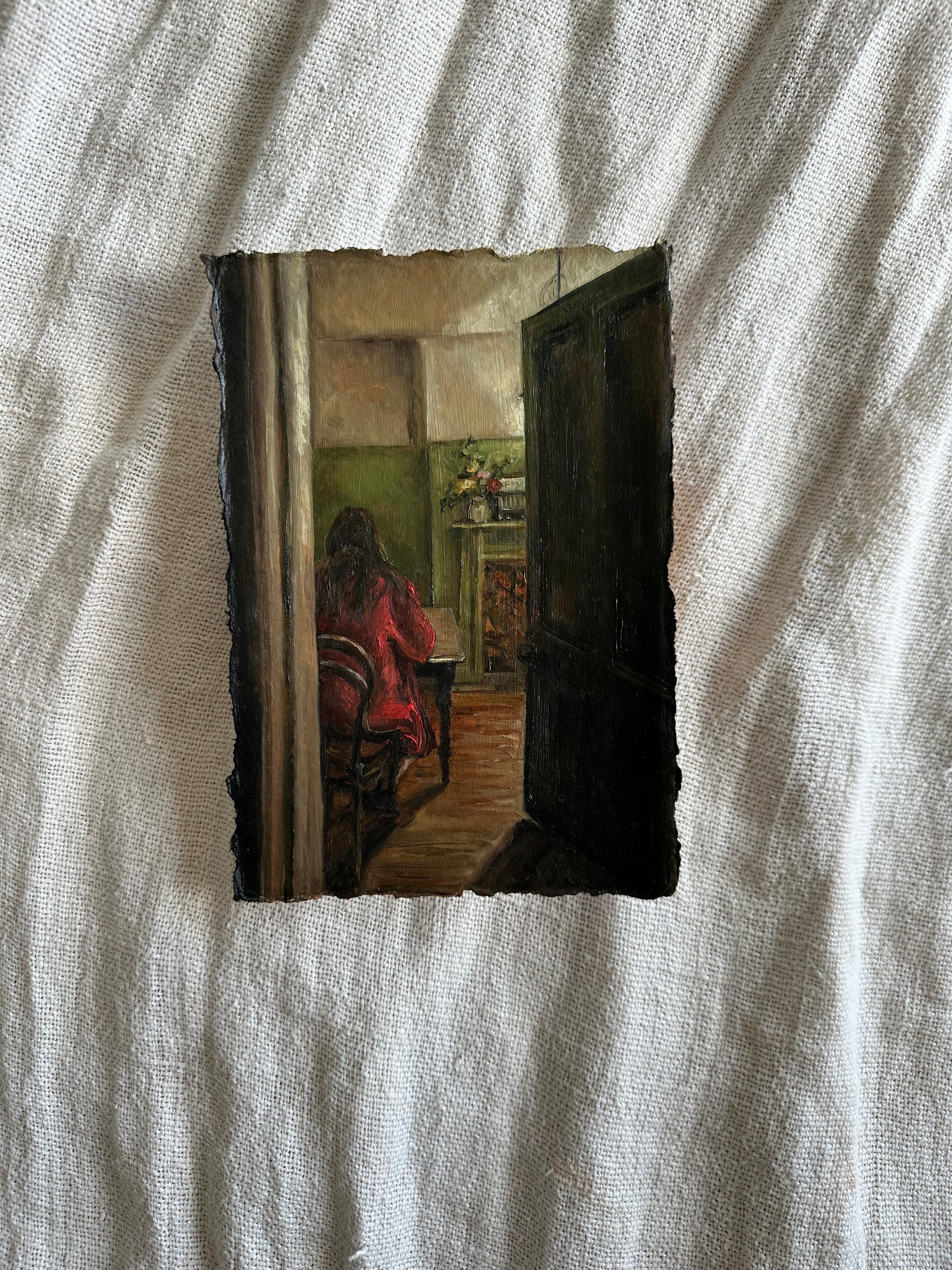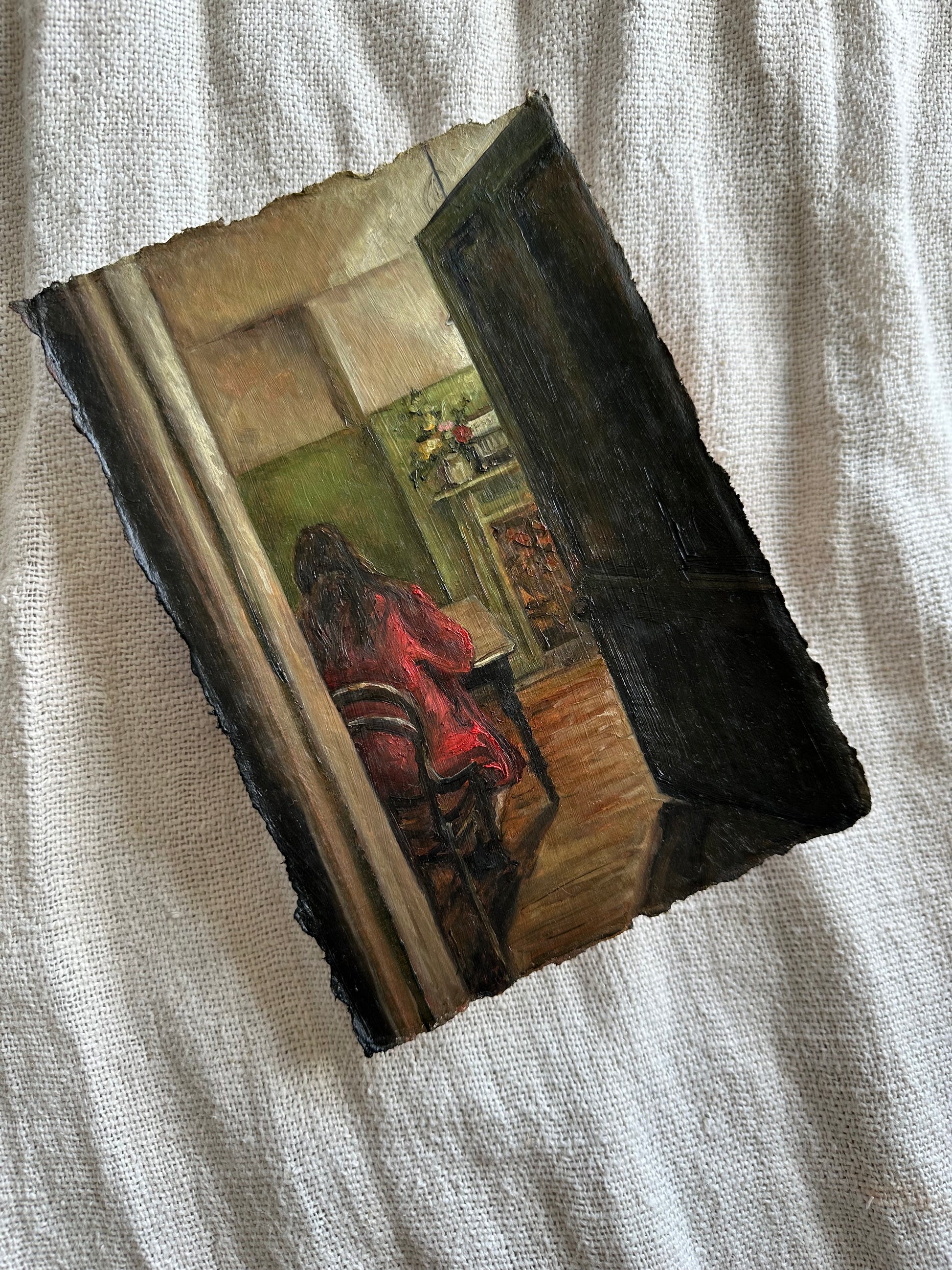 “The Red Coat” Original oil painting on handmade paper with deckled edging will be varnished and signed on the back once dry. Roughly A5 measurements due to the handmade nature of the paper (5.8” x 8.2”)