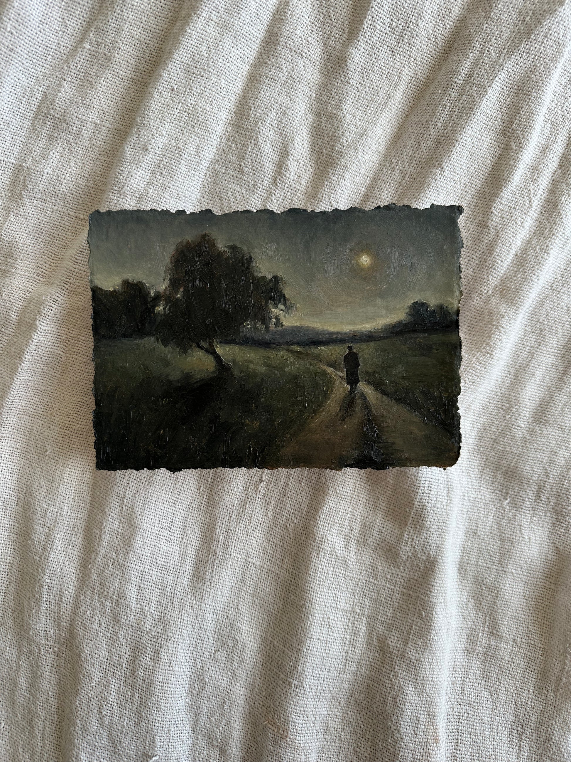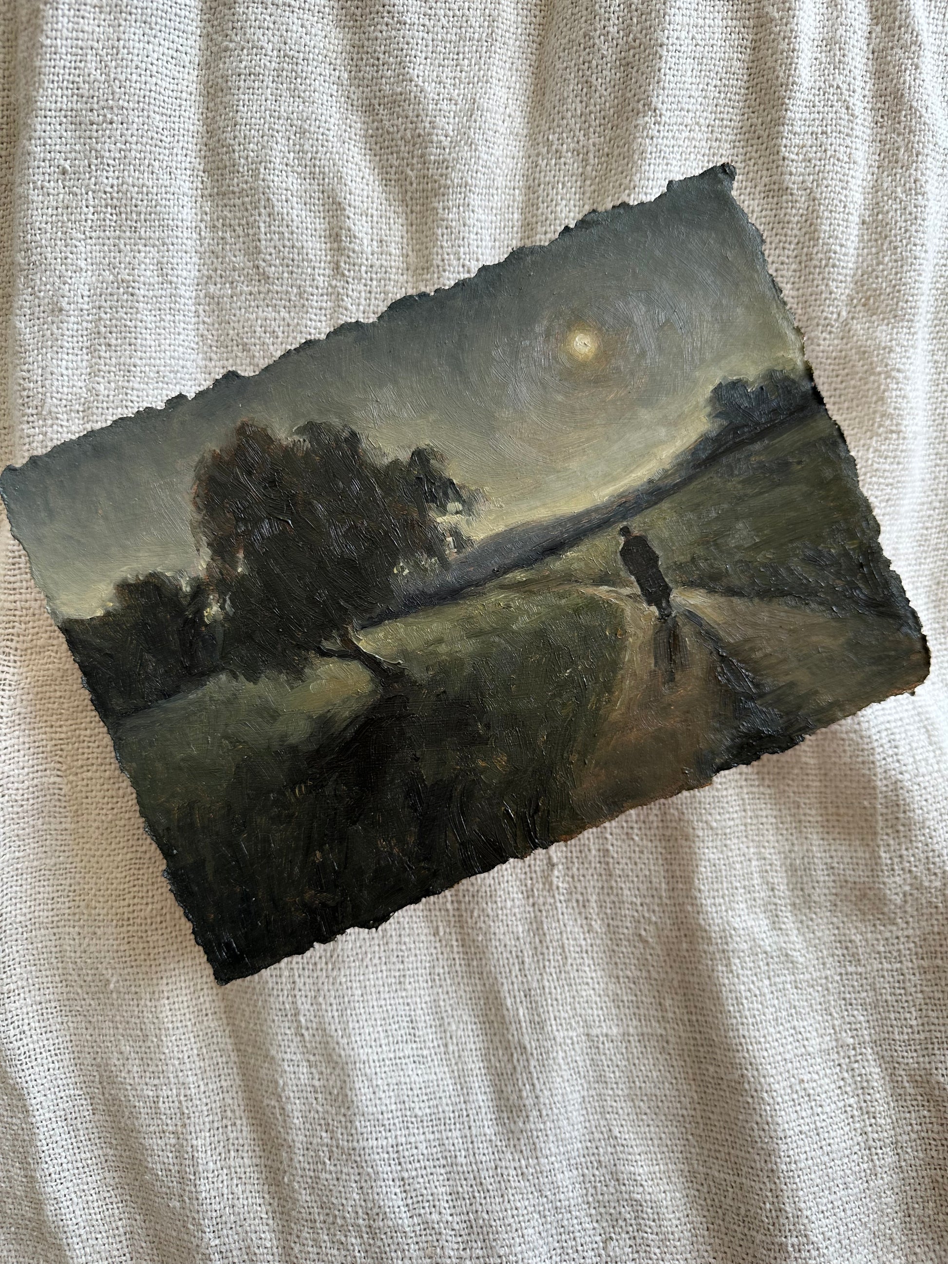“Walking Through my Mind” Original oil painting on handmade paper with deckled edging will be varnished and signed on the back once dry. Roughly A5 measurements due to the handmade nature of the paper (5.8” x 8.2”)