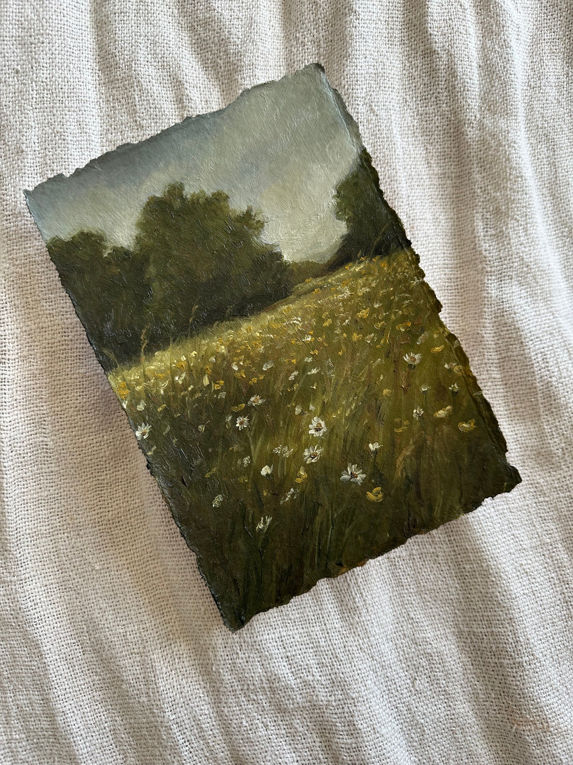 “Wildflowers in France” Original oil painting on handmade paper with deckled edging will be varnished and signed on the back once dry. Roughly A5 measurements due to the handmade nature of the paper (5.8” x 8.2”)